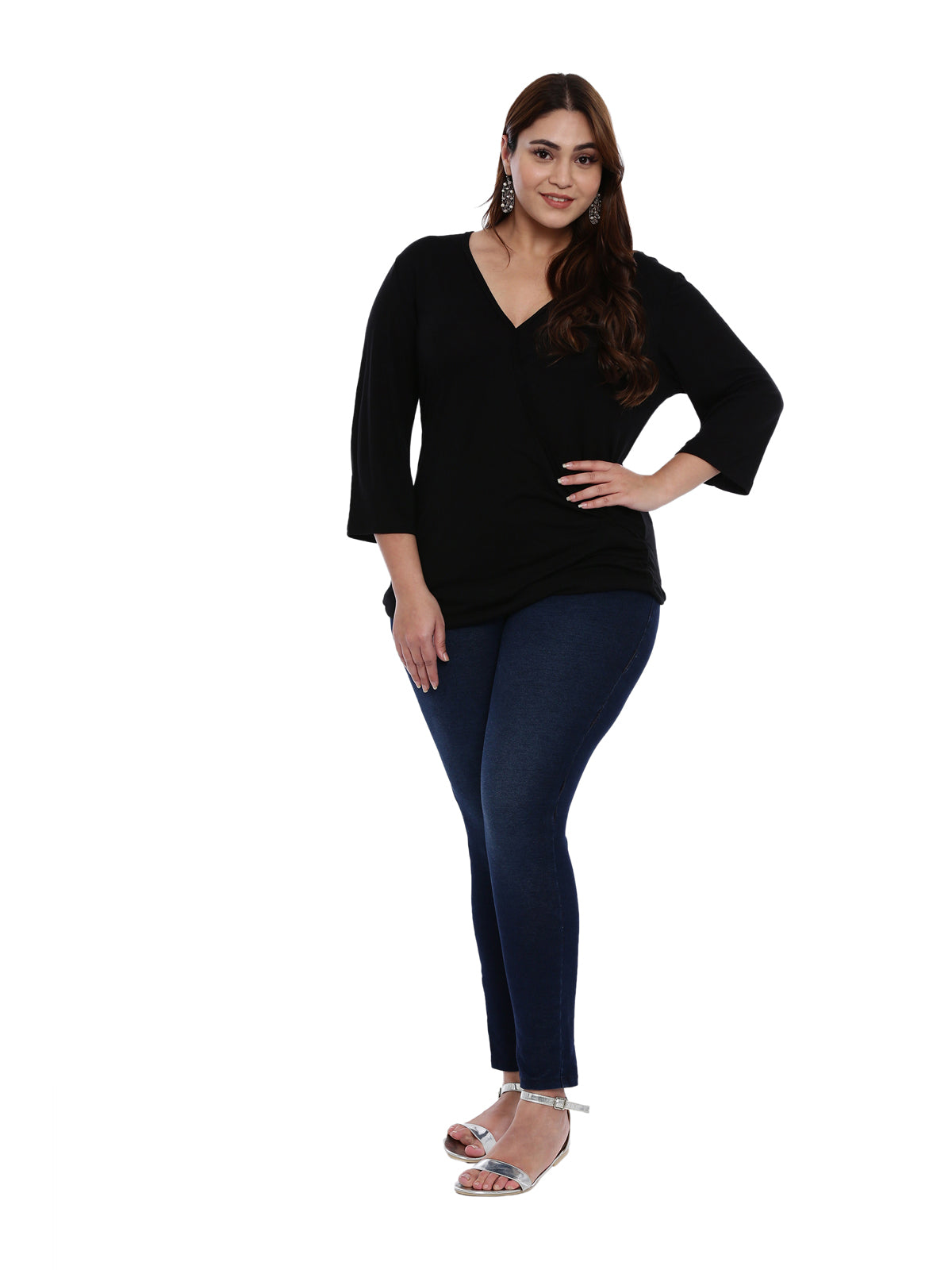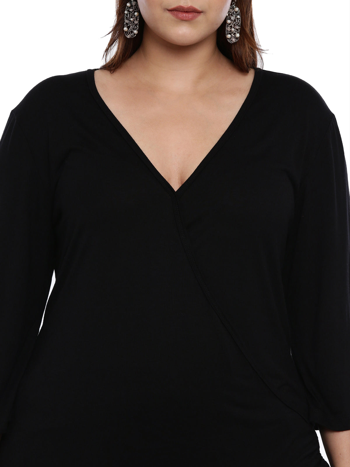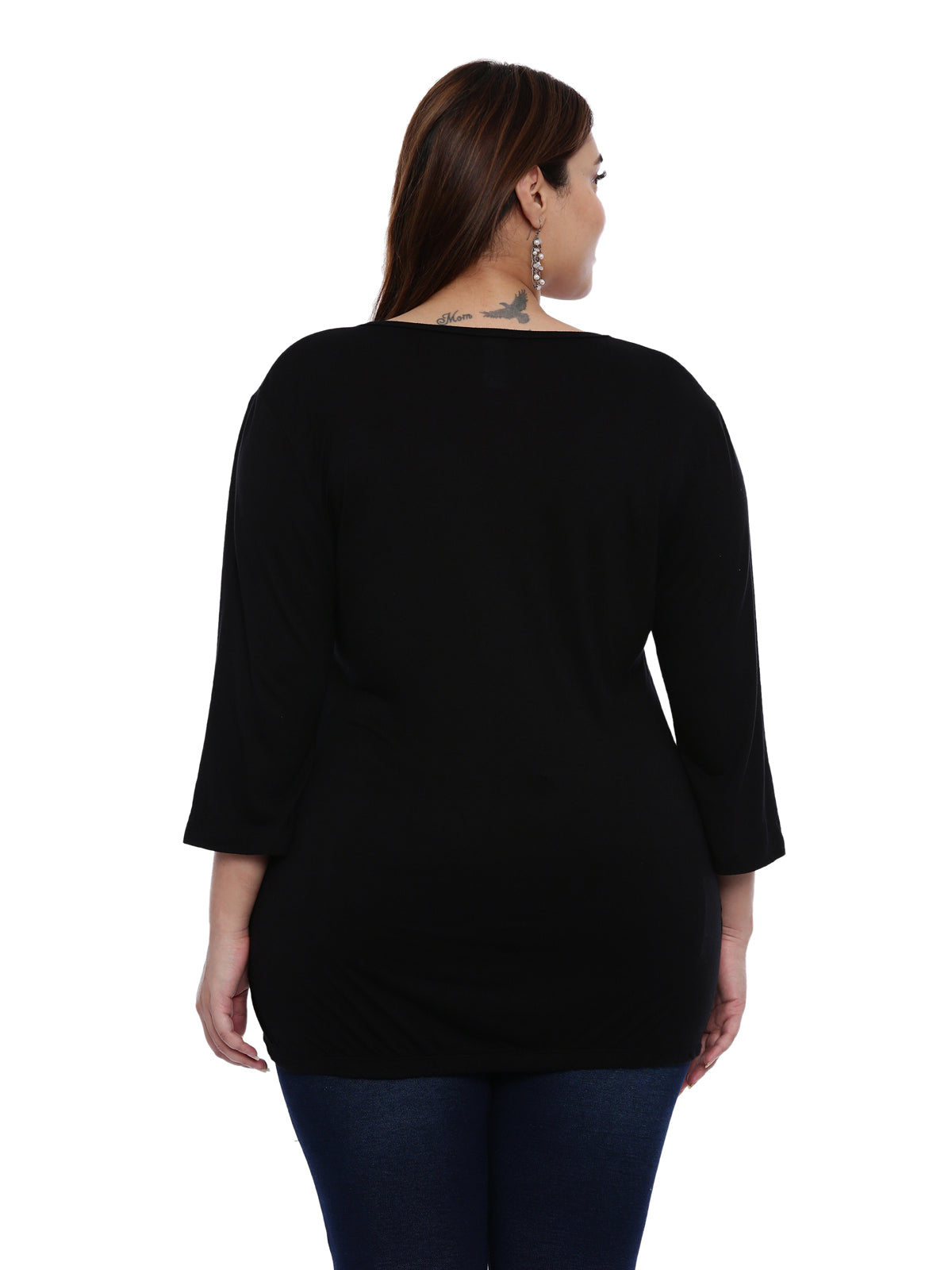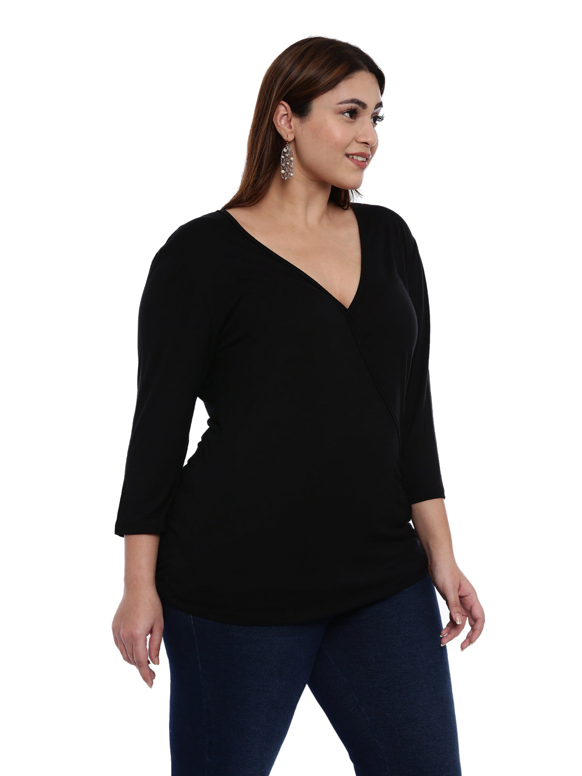 Elevate your everyday style with this chic The Pink Moon Women Plus Size Black Solid Overlap Top with three-quarter sleeve top. Grab a casual bite to eat outside in this black piece with worn jeans and comfortable shoes.