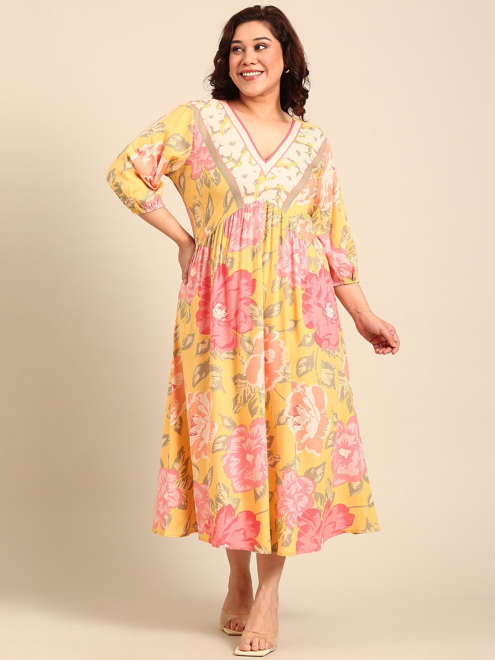 Yellow Bloom dress in a silhouette your curves will love, with shimmer fabric, a striking deep V-neck, long sleeves, and gathered detail at the waist.
